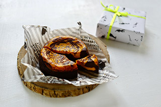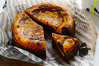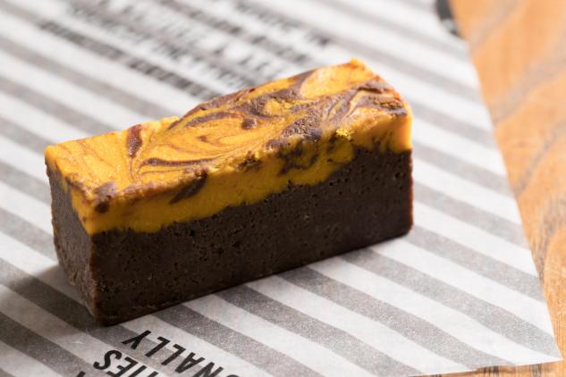 フランス産クーベルチュールに栗マロンかぼちゃのチーズケーキを合わせてマーブルに仕上げました。チョコレートと栗マロンかぼちゃが合わさると、とてもマイルドになり、まるで生チョコのような食感のブラウニーです。とてもしっかりしているのでスティックタイプ1つでもとても満足感があります。