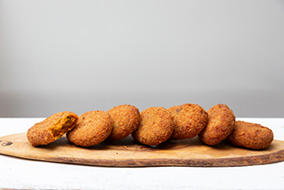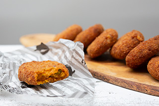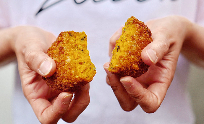 栗マロンかぼちゃと合い挽きミンチだけを使い、衣付けして仕上げた人気の一品。