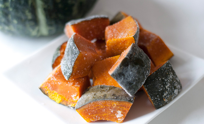 - 栗マロンかぼちゃが1番美味しい状態になるよう、95度で約20分スチームし芯まで火を通して甘さを最大限引き出します。さらに粗熱を取って冷ましたあと、一気に急速冷凍。美味しさをそのまま閉じ込めます。